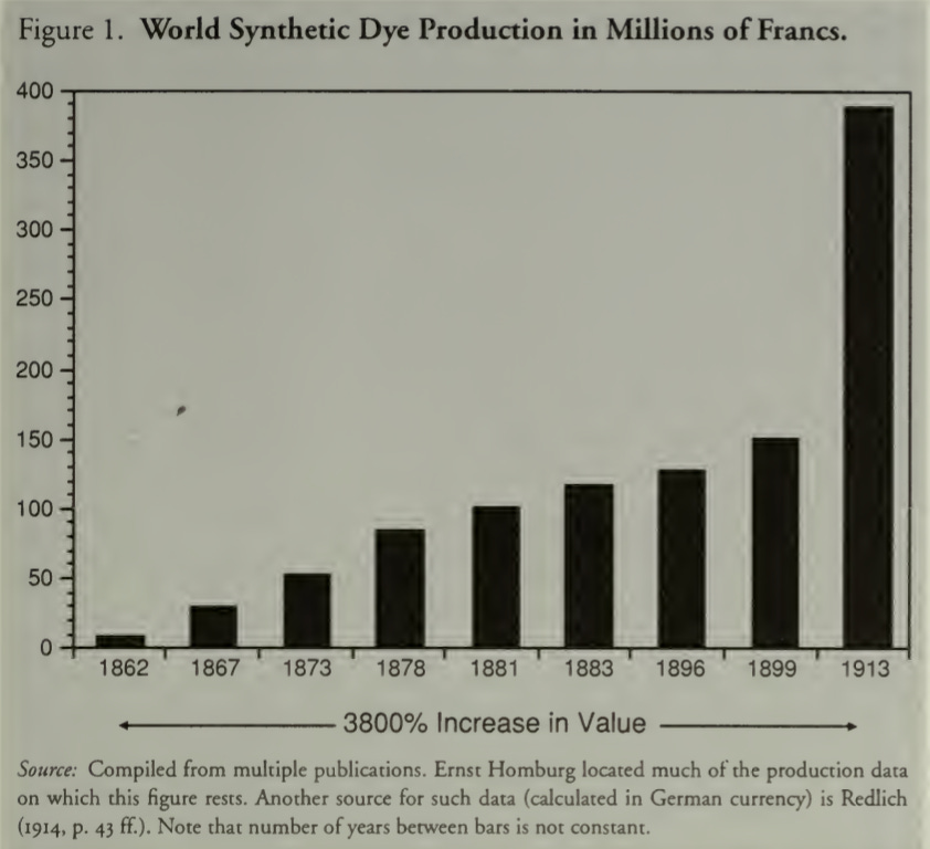 Johann Peter Murmann and Ernst Homburg, “Comparing Evolutionary Dynamics Across Different National Settings: The Case of the Synthetic Dye Industry, 1857–1914,” Journal of Evolutionary Economics 11, no. 2 (2001): 190-191, citing Thissen (1922, p. 18). The 85% figure for Germany’s market share is from Murmann, Knowledge and Competitive Advantage.
